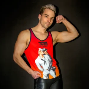 Make a splash this summer, with our sunny Tom of Finland “Slutty Sailor” mesh tank top. This tank is breezy & eye-catching — fully sublimated with a classic Tom illustration on the front, and the TOM logo on the back. It is made from moisture-wicking activewear fabric, and cut for comfort & stretch.